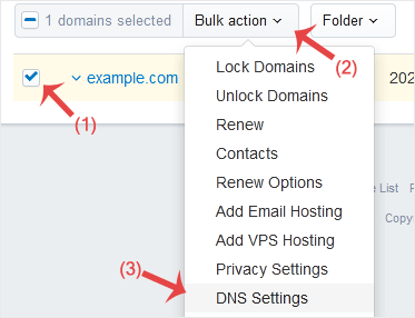 4. Check the box next to your domain name(s) and click on the DNS Settings from the Bulk action drop-down menu.