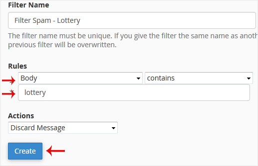 6. You can filter email with many options in the filter rules. If you want to deal with an email containing a word such as Lottery or other words, select Body in the first list box and select Contains in the second one.