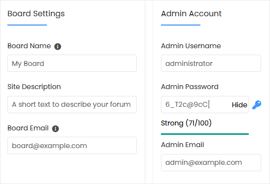 • Admin Username: Your new phpBB username (for security reasons, do not use the administrator or the admin username).