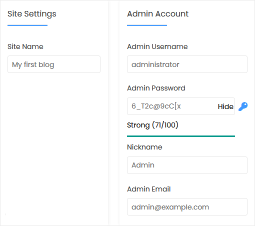 • Admin Username: Your new PivotX username (for security reasons, do not use the administrator or the admin username).