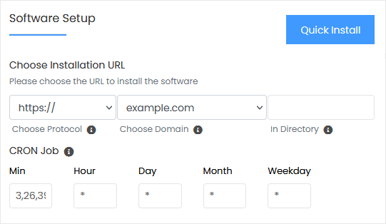 - Choose Installation URL: Choose the appropriate protocol/domain. Inside the "In Directory" field, should you want to install this in a directory, i.e., example.com/directory, enter the directory name. Otherwise, please, leave it blank to install in your main domain, i.e., example.com.